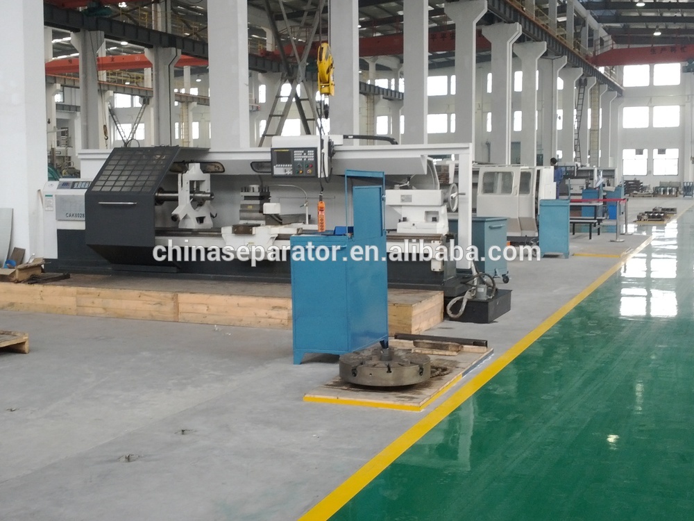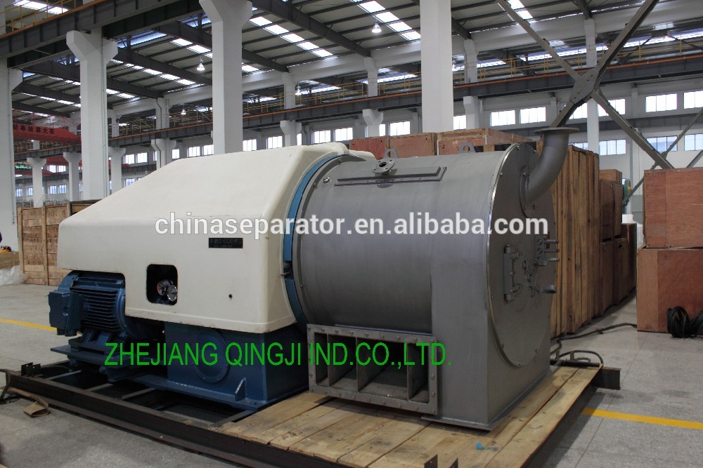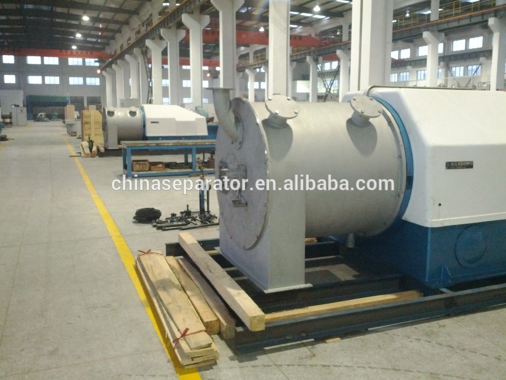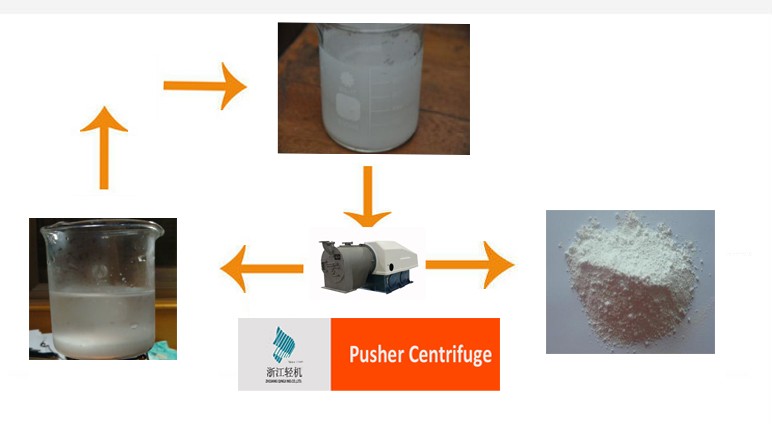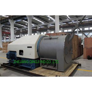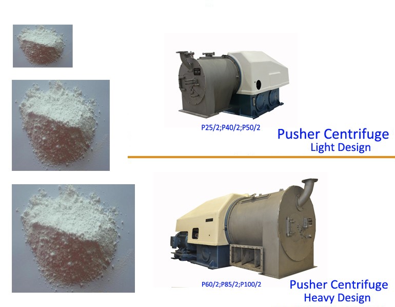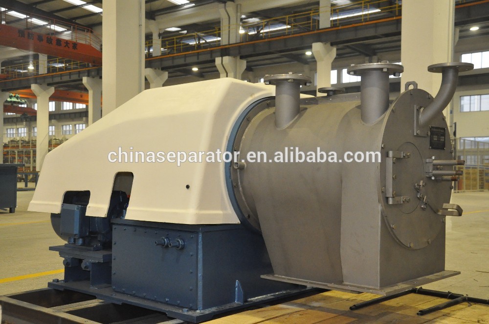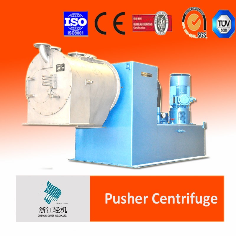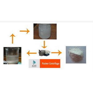 Two-stage Pusher Centrifuge is a kind of perforated basket centrifuge, which works both continuously and effectively. The mixture to be separated is fed through the feed pipe to the distributor continuously and evenly distributed to the wall of first stage basket. Most of the mother-liquor which is filtered by centrifugal force from the feed departs through the sieves into the liquor-collecting casing where it will be discharged out of the machine. The first stage basket rotates and reciprocates The formed filter cake is pushed into the second stage basket as the first stage basket is rotating and reciprocating .The cake can stay in the centrifuge for a sufficient time and therefore the required Moisture content of the cake can be achieved under the powerful centrifugal force.