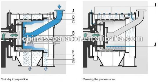 Afterwards, the cake is continuously discharged out of the basket. The effective washing can be carried out in the centrifuge in case of requirement of high purity of the solid product. The washing liquid and the mother-liquor can be discharged separately if necessary.