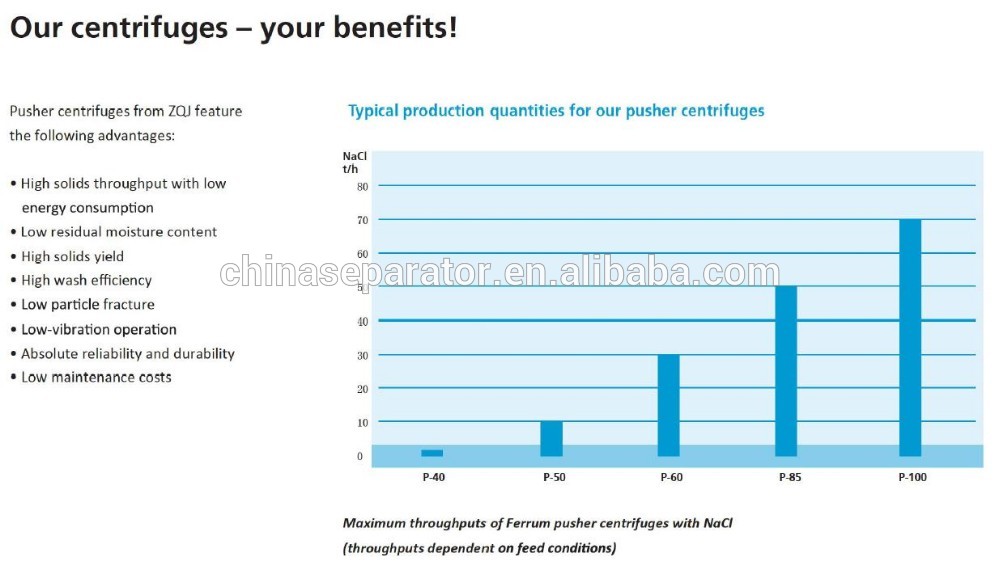 our pusher centrifuges P-40 to P-100 guarantee best solid-liquid separation with high and constant product quality in the basic, agricultural and petrochemical industries.
