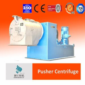 Two-stage Pusher Centrifuge is a kind of perforated basket centrifuge, which works both continuously and effectively. The mixture to be separated is fed through the feed pipe to the distributor continuously and evenly distributed to the wall of first stage basket. Most of the mother-liquor which is filtered by centrifugal force from the feed departs through the sieves into the liquor-collecting casing where it will be discharged out of the machine. The first stage basket rotates and reciprocates The formed filter cake is pushed into the second stage basket as the first stage basket is rotating and reciprocating .The cake can stay in the centrifuge for a sufficient time and therefore the required Moisture content of the cake can be achieved under the powerful centrifugal force.