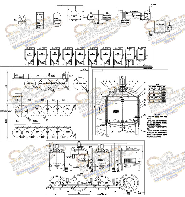 | Mash tun | 200L | 910×1870mm | inner tank:SUS304; outside cladding: SUS304 or red copper | 1set | effective volumn 200L; insulation thickness:80mm; inner tank thickness:2.0mm; other technical details:2.0mm cladding surface wire drawing finish; welding seams brushed. steam heating way(steam heating jacket, 0.25m2 heating area) or electric heating way( total power of the electric tube :12kw), mechanical agitation :cycloidal reducer, motor power 0.37kw, speed ratio:1:29 |