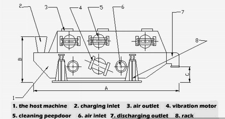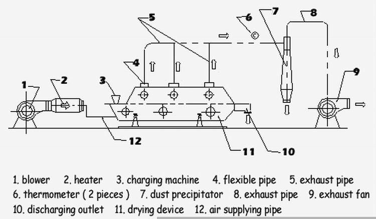 Two equipped vibrating motors in the host machine produce exciting force, which makes materials leap forward. Hot air passes material layer through orifice plate in an upward direction to achieve the purpose of dehydration.