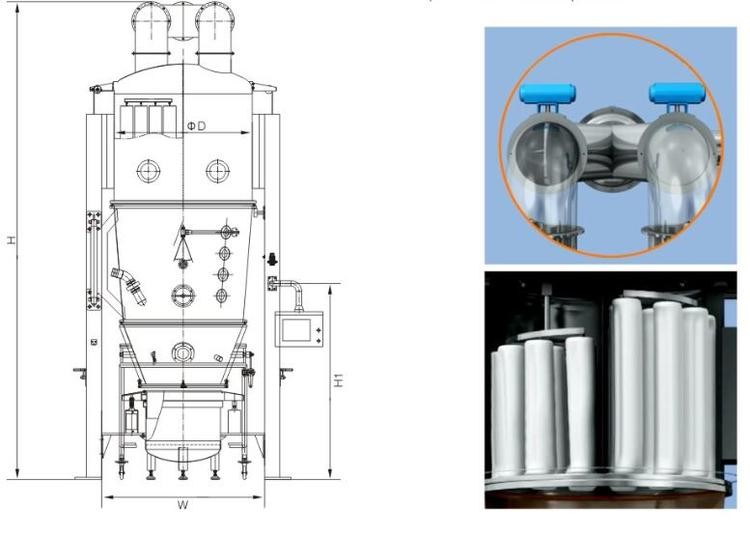 The machine is composed of main machine, air handling system, heating system, exhaust and dust filter system etc. When it works, the materials enter the hopper of the fluid bed dryer. Set the procedures and parameters according to process requirements and the machine will start working. After filtered by the air handling system and heated by the heating system, the air enters the main machine. After the materials are fluidized by hot air, the moisture is evaporated rapidly and the materials are dried instantly. After the operations are completed according to the set procedures and parameters, the material silo is pushed out and assembled onto the JTZ series lifting and turning granule sizing machine for lifting discharging, so as to effectively control dust pollution and cross contamination.