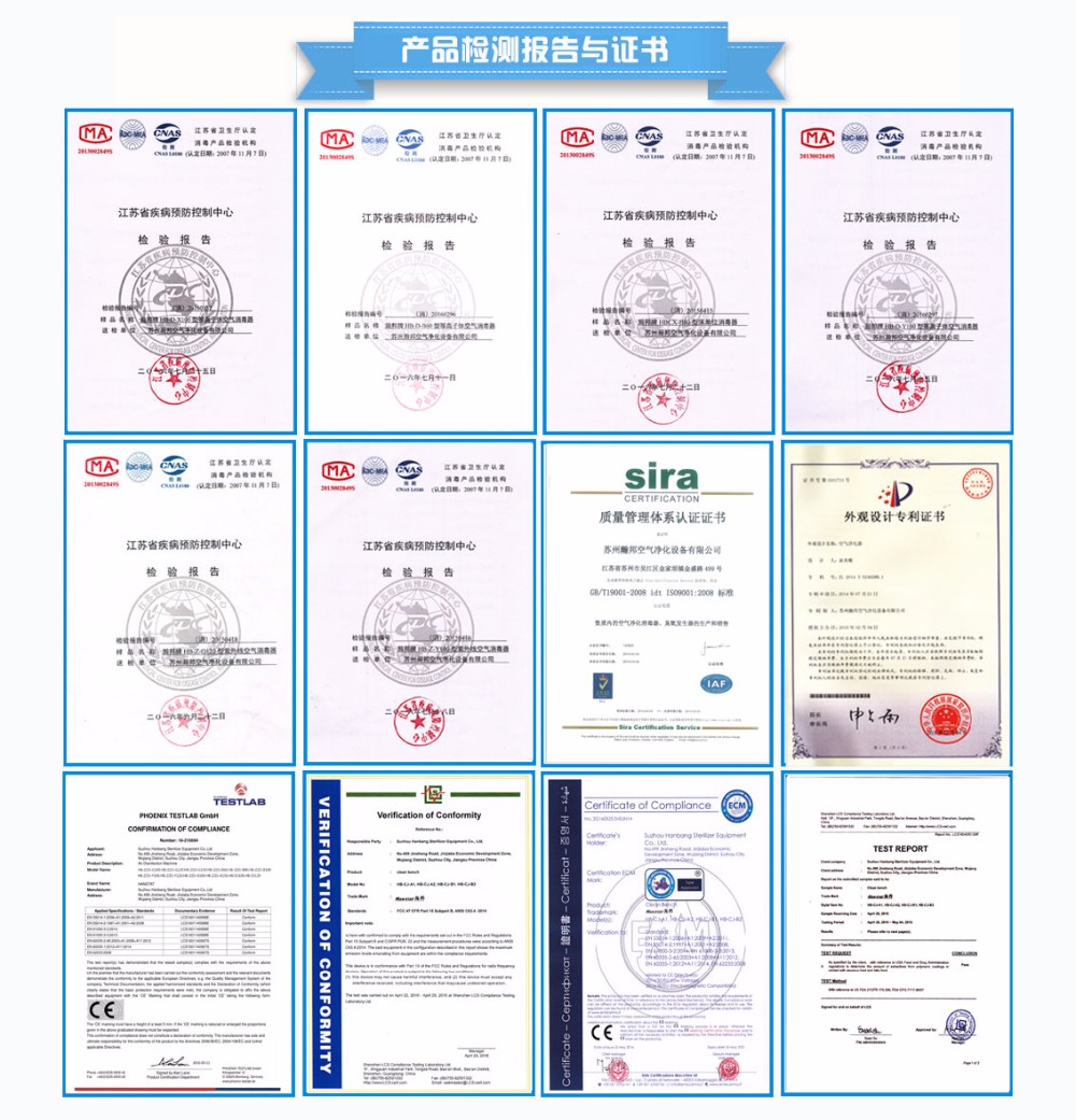 The main products include: Dynamic and static ultraviolet disinfector, Plasma sterilizer, Electrostatic precipitator, Ozone sterilization cabinet, Ozone generator, Bed unit disinfector, Clean workstation, Medical purification screen, Biological safety cabinet, and other series disinfection products and air purification equipment.