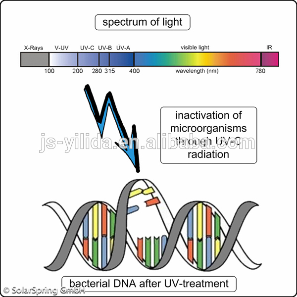 UV sterilizers work on the principle that special fluorescent UV lamps can effectively irradiate (kill) microorganisms in aquarium water when they are exposed to this light. UV light, at a peak wavelength of approximately 254 nanometers, alters the genetic material in the organism's nucleus and shortens its normal life cycle. Theoretically, UV sterilizers can kill viruses, bacteria, algae, and protozoa with no residual effects. However, the organisms must be free-floating and travel through the UV sterilizer unit for the sterilizer to work. It has no effect on organisms attached to fish or rocks because they do not flow through the unit and cannot be exposed to the UV light, pretreatment may need be added to the water system. Prefiltration is required to remove color, turbidity, and particles that shield microorganisms from the UV source. Water that contains high mineral levels can coat the lamp sleeve and reduce the treatment effectiveness. Therefore, pretreatment with a water softener or phosphate injection system may be necessary to prevent build-up of minerals on the lamp.