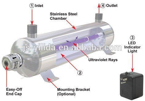 UV light disinfection is an effective method in destroying micro-organisms in a water stream and an endorsed technology currently being used by a wide range of manufacturers and industries. UV radiation has three wavelength zones: UV-A,UV-B, and UV-C, and it is this last region, the short wave UV-C, that has germicidal properties for disinfection. Ultraviolet systems use low-pressure mercury lamps that emit UV light in the range of 254nm that attacks the microorganism and stops the microorganism's ability to function and reproduce.