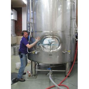 is a dish-bottomed pressure-rated temperature-controlled tank used to hold beer in preparation for packaging. The term “bright” refers to “bright beer,” beer that has been rendered bright (clear) by filtration, centrifugation, fining, and/or maturation. In most breweries, beer will be filtered after leaving a uni-tank or lagering vessel and be directed into a bright tank. If the beer is to be force-carbonated, then the beer may be carbonated in-line, under pressure, between the fermenter or lagering tank and the bright tank. In this case, the beer should arrive at the bright tank with full carbonation. For in-tank carbonation (or adjustments), the bright tank will be fitted with a carbonation stone, a device through which carbon dioxide is forced, dispersing fine bubbles into the liquid for fast dissolution. Carbonation stones are usually made from either porous stone or sintered stainless steel. After carbonation, the beer is ready to be bottled or kegged (or both) directly from the bright tank. As the bright tank is the last stop before the package, careful attention is paid to quality assurance at this stage. Carbonation is closely checked and the brewery’s laboratory will run a series of tests.