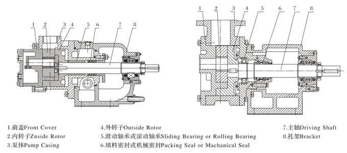 NYP Standard heavy oil high viscosity rotor pump have internal and external rotor, shaft, pump body, front cover, bracket, seal and bearing components. The asphalt pump sealing ways has mechanical seal and packing seal two forms. If it is high temperature, high viscosity and corrosive medium, can choose packing seal.