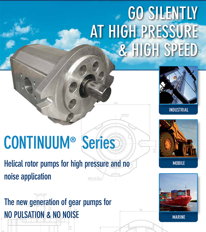 Reducing noise in the workplace has become a necessity for many companies. By now most companies have recognized noise as a cost weighting on the economics of their businesses. Noise pollution remains a serious problem to be solved for both stationary and mobile machinery. Hydraulic pumps, above all those for high pressure, entail unacceptable noise and/or vibration levels in many different applications. Up to now the noise problem has always been approached in the only possible way: with secondary and expensive activities such as using pulsation dampers, hoses, damping rails and rings, encapsulating the hydraulic components or the entire system and so on. SETTIMA decided to start to design a new gear pumps generation capable to reduce as much as possible the acoustic emissions and the consequent vibration level. Some years ago the result was the Continuum® pump series, able to reduce down to 52 dB(A) the normal operation noise. Today SETTIMA presents the new generation of Continuum® pumps, silent as always, but much more efficient and with longer lifetime even at heavy duty, at all pressure and speed ranges.