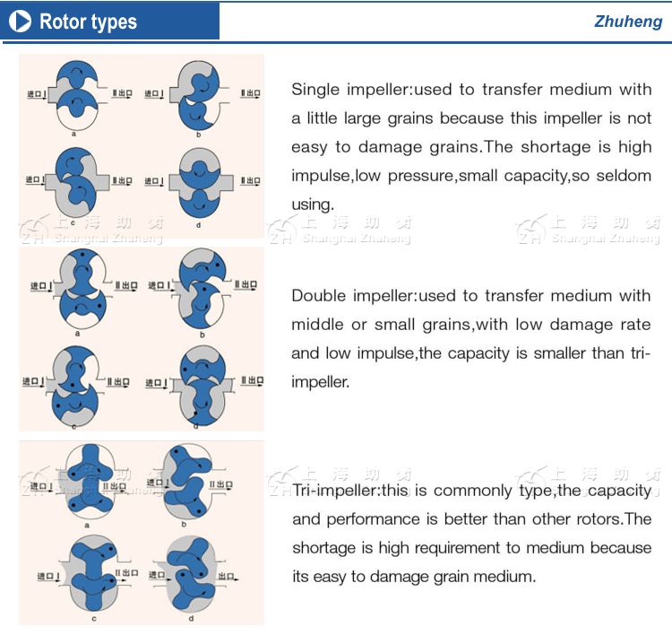 Rotor pump is also named colloid pump, three-lobe pump, sole pump, etc. When the 2 simultaneous reverse rotating rotors revolve, it produces suction force at the inlet (vacuum), which intakes the material delivered.