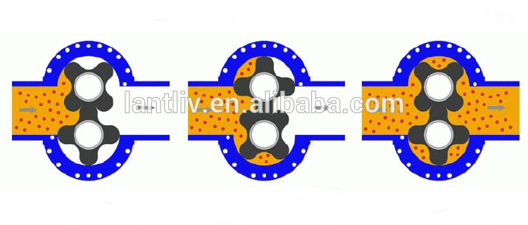 Rotor pump is also named rotary lobe pump, three lobe pump, sole pump etc. When the two simultaneous reverse rotating rotors (with 2-4 gears) revolve, it produces suction force at the inlet (vacuum), which intakes the material delivered. The 2 rotors divide the rotor housing into many smaller parts and revolve in the sequence of A--B--C--D. When it revolves to position A, only housing I is filled with medium .When it revolves to position B, housing B encloses part of the medium; when it goes to position chousing A encloses medium, and finally it goes to position D, then housing A , B and II are interlinked and the medium is transported to the outlet. As this process is repeated, medium material is transported continuously.
