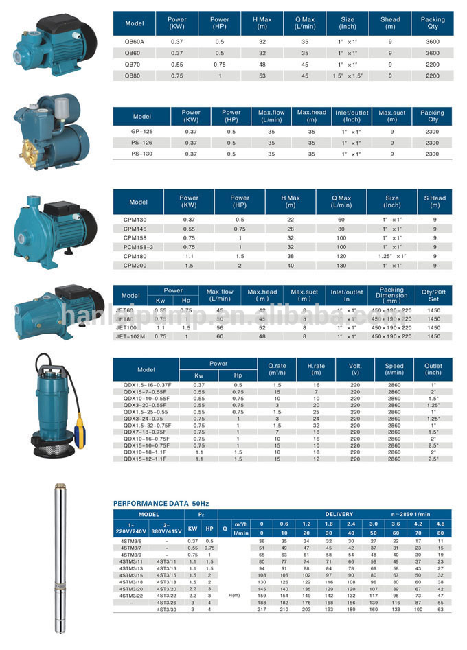 - Single phase 220V/50Hz, brass impeller, carbon steel motor shaft, with thermal protector inside.