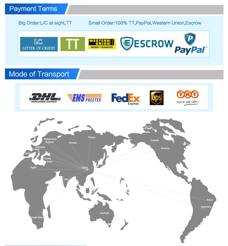 2) Q:What payment methods your company accept?A:We accept most ofthe payment methods,but mainly accept T/T,L/C,Western Union,Paypal and MoneyGram.