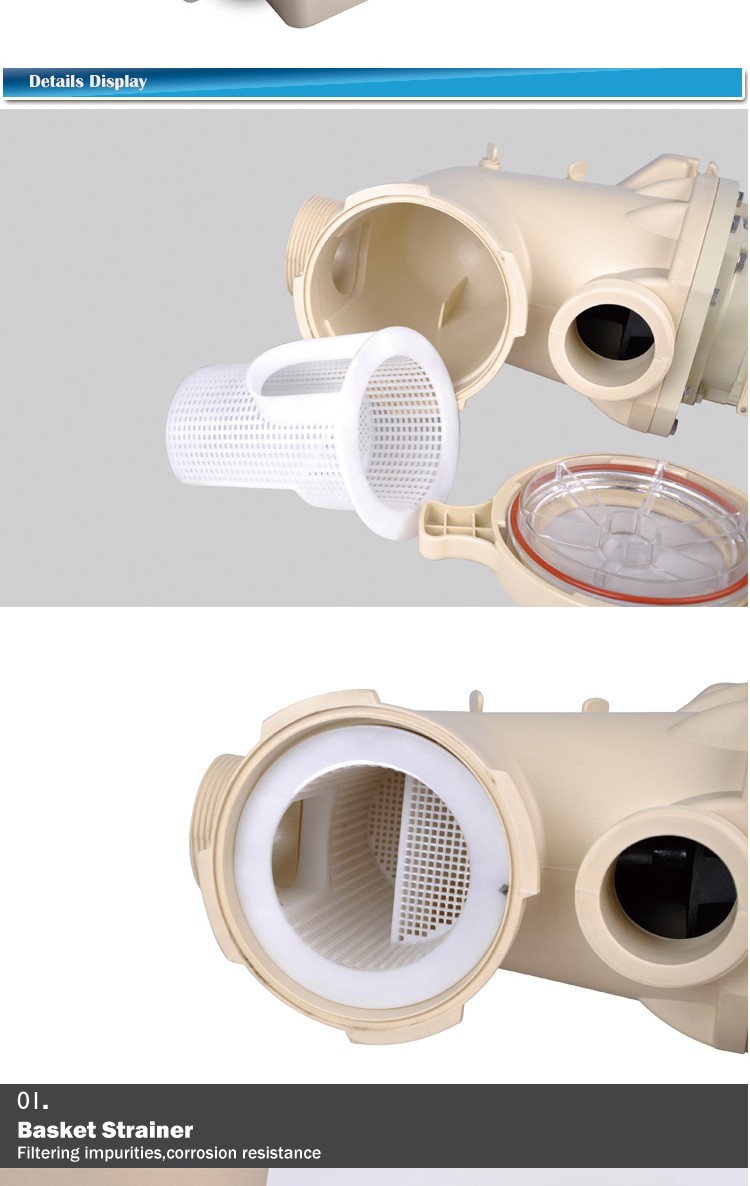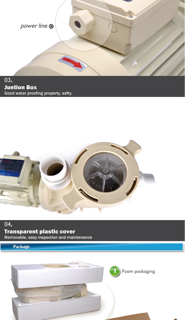 Anti-rust crust can stop water penetrating the engine. Enough power, high head, big flux and high efficient circulation. Smaller noise and run quietly. The pump cover bears high airtight preventing the leaking. The main part of the pump is made of special plastic which is anti-high or low temperature so it is durable .Convenient to handle, easy to maintain, with the supplying of spare parts.