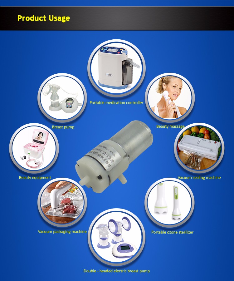 A: Used in Small home appliances, medical massage equipment, medicine nebulizer, Dilatancy machine, memory pillow, breathing machine, display cabinets, aquariums, tourniquet, sphygmomanometer, gynecological treatment apparatus, enema machines and other rehabilitation therapy devices and other products.