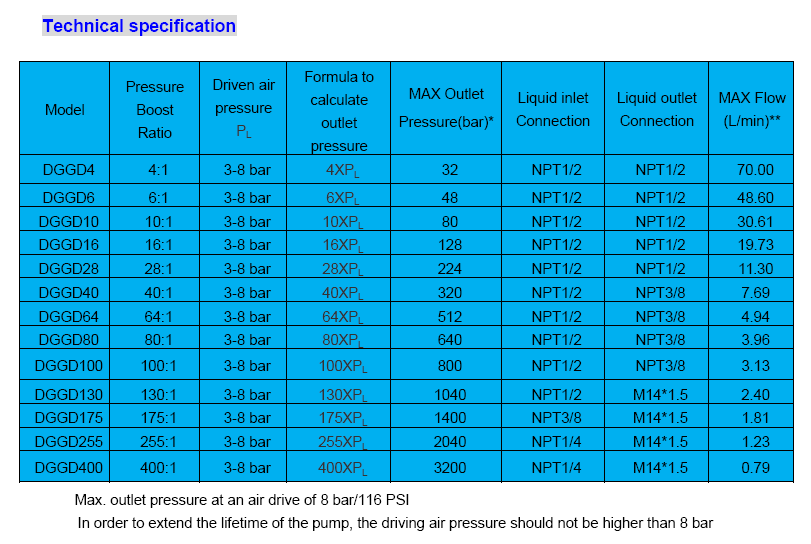 2.In order to extend the lifetime of the pump, the driving air pressure should not be higher than 8 bar