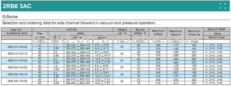 Item NO. | Stage (S/D/3) | Frequency (HZ) | Power (KW) | Voltage (V) | Current (A) | Air Flow (m³/h) | Vacuum (mbar) | Pressure (mbar) | Sound dB(A) | Weight (KG) |