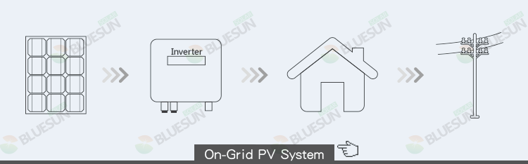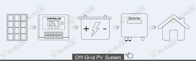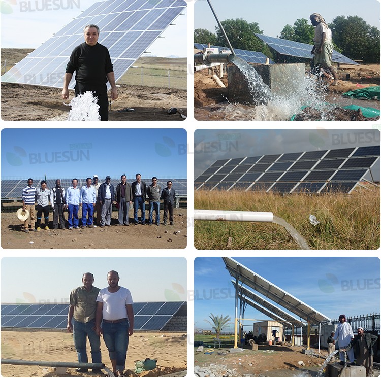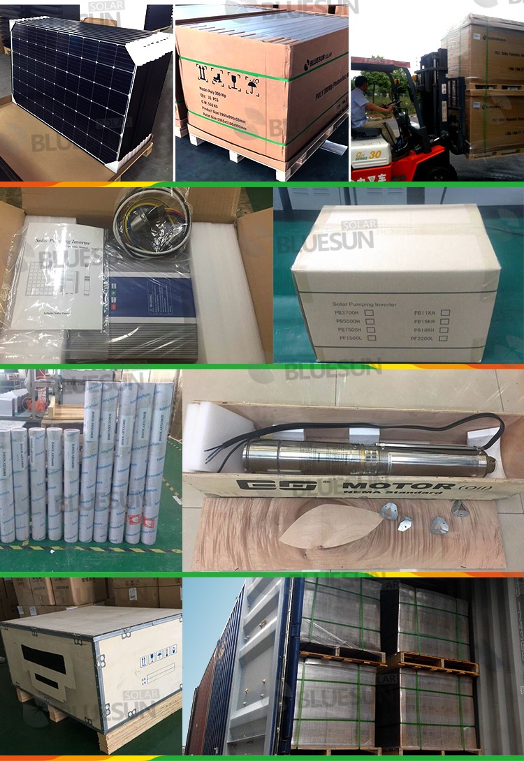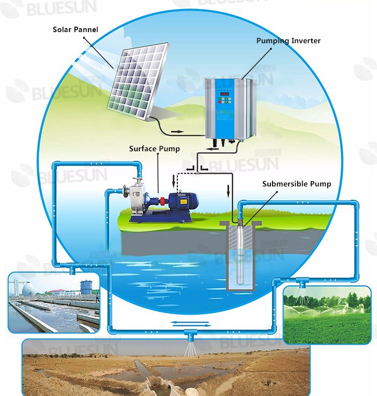 Bluesun solar pumping system mainly consists of solar panels, the specialized pump inverter and water pump.