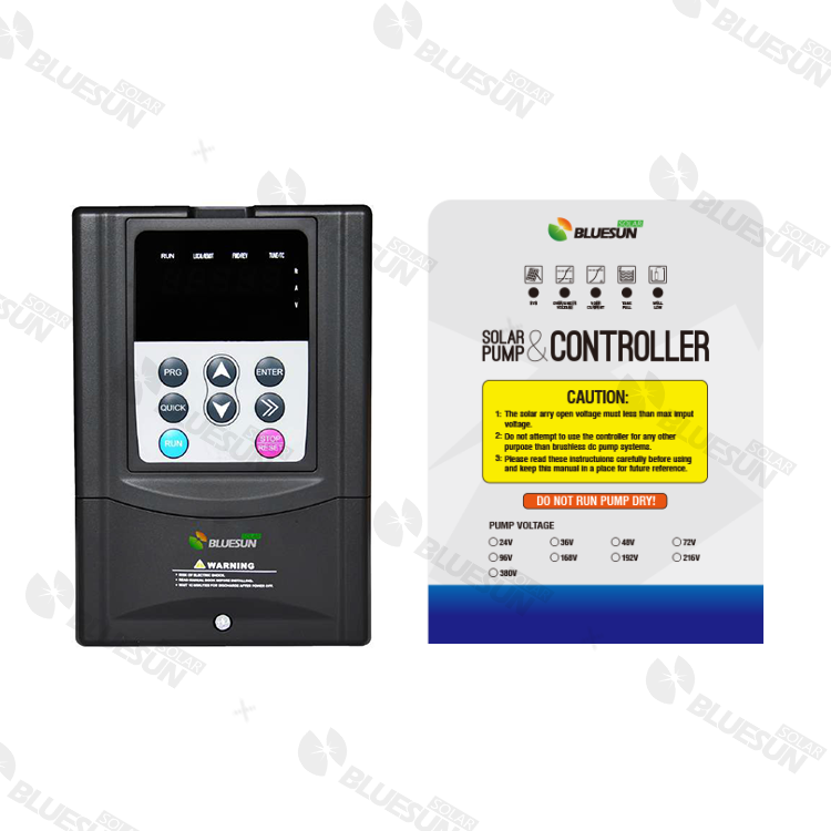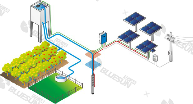 Bluesun solar pumping system mainly consists of solar panels, the specialized pump inverter and water pump.