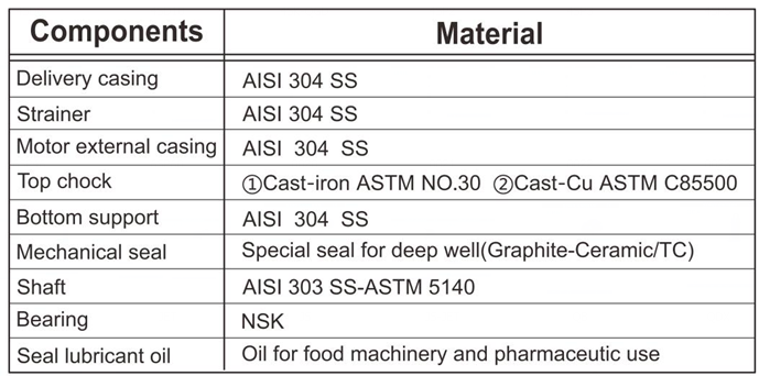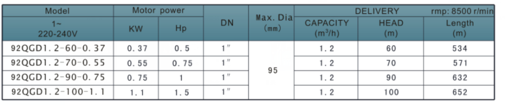 Maximum fluid temperature up to +35Cº Maximum sand content:0.25% Maximum immersion:90m Maximum well diameter:4" |