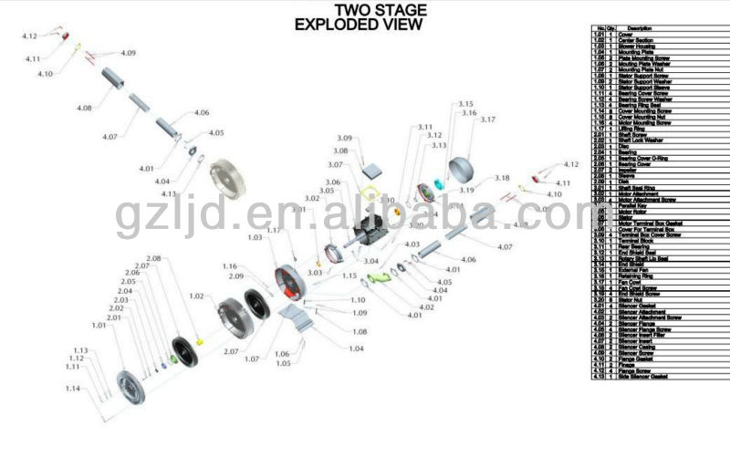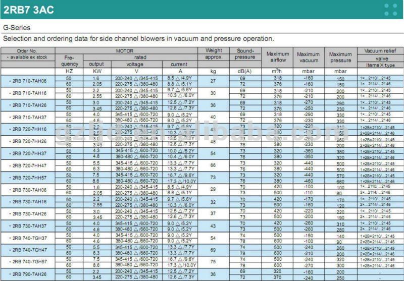 Item NO. | Stage (S/D/3) | Frequency (HZ) | Power (KW) | Voltage (V) | Current (A) | Air Flow (m³/h) | Vacuum (mbar) | Pressure (mbar) | Sound dB(A) | Weight (KG) |