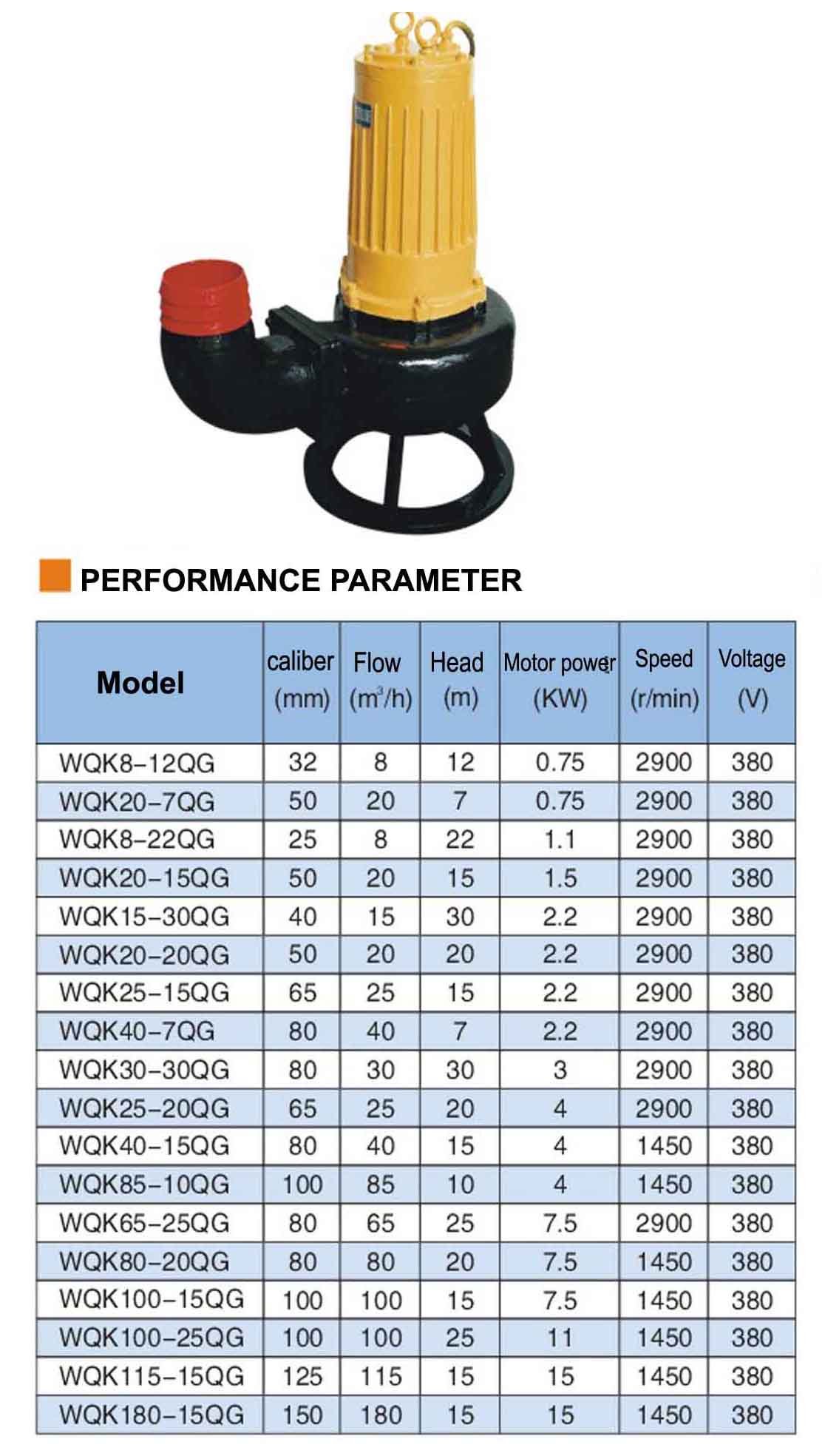 WQK/QG Submersible Sewage water pumps with cutting device is capable discharging large grain contained waste water, by effectively cutting the long fiber, plastic, paper, belt, cloth, grass etc to small pieces. With advanced technique and best hydraulic characteristic model, the pump can run reliable and smoothly within the flow range. Combined with the motor dry inside, the pump with high efficiency can compared with the AS Submersible Pump of Germany ABS. The electric pump has adopted high quality hard alloy, double mechanical seal and framework oil seal. In order to let the pump perform well and guarantee worker’s safety, the electric leakage protector should be equipped with the motor. For a long working hour, the motor can be partially put above the water level. But the part in air should be less than half of the motor height. The medium(waste water) temperature should not be more than 40°C.