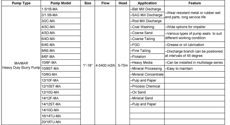 Pump Type MA/MAR is the standard heavy duty slurry pumps which designed for the continuous pumping of highly abrasive,high density slurries with minimal maintenance requirements,It maintains high efficiencies over the wear life of its components.This type of pump typically used in process plant transfers,wet waste processes,recycling-washing plants,sand plant duties, heavy minerals processing,mineral recovery and chemical process plant.
