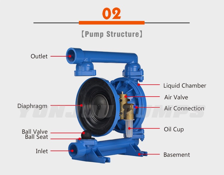 2. It has two diaphragms, the compressed air come to the pump body to drive the pump in the constant action of sucking and releasing, so it can pump the liquids easily by this principle. Also it is very safe in dangerous environment since it has no electric motor.