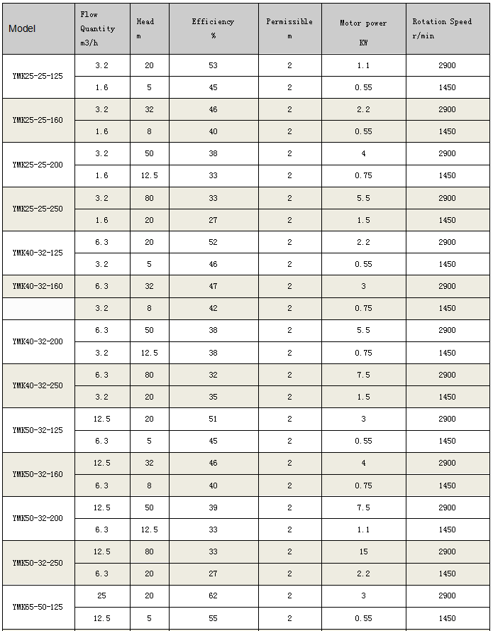 | Parameters of YMK series Starch Pump, Solid Slurry Pump | ||