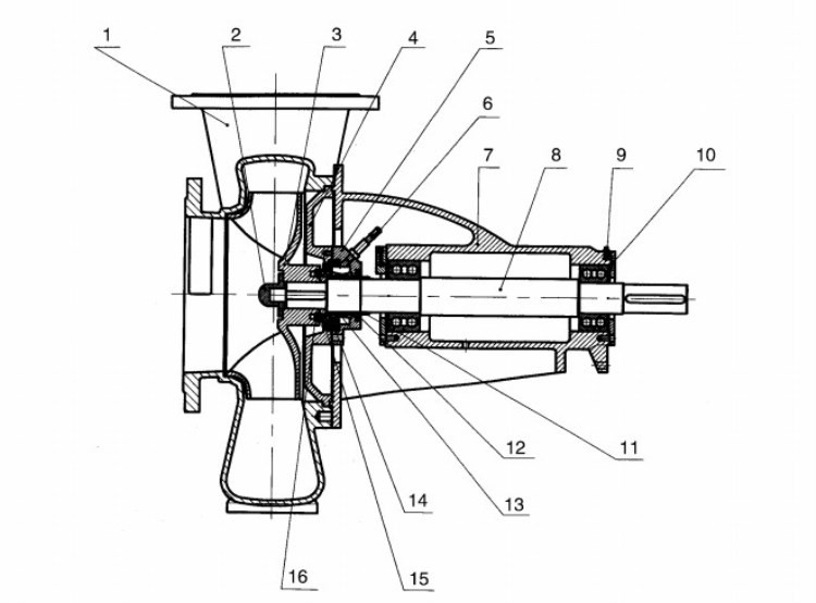 1. Pump Casing 2. Impeller nut 3. Impeller 4. Pump cover 5. Mechanical seal end cover 6. Cooling water mouth 7. Bracket 8. Axle 9. greasing fitting 10. Bearing cover 11. Sleeve 12. oil seal 13. Spring 14. Static ring base 15.Seal static ring 16. Seal dynamic ring