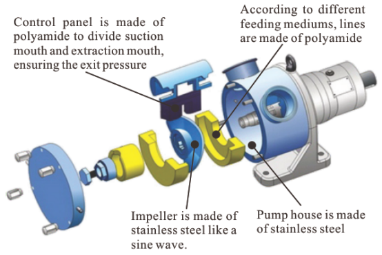 1. The sine wave shape of impeller means a cavity can be formed at every rotation (4 cavities can be formed every passing the lining space). This operation can "push" or "release" flowing products. The pump cavity is divided into suction chamber and extraction chamber by control panel to ensure pressure tolerances at exit and entrance. Meanwhile, control panel plays another important rote to lubricate the pump bearing by product in compulsion.