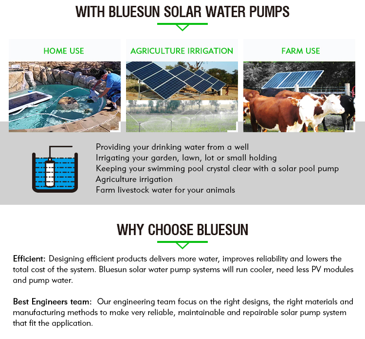 As a professional manufacturer of complete solar power system and solar water pump system ,Bluesun offer practical, professional and affrodable AC and DC solar powered water pumping system to residential and commercial application.