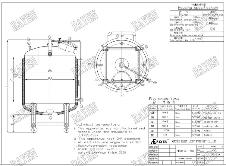 5. General accessories(If required):Manhole, CIP, respirator, sight glass, mixing(Top side or bottom)
