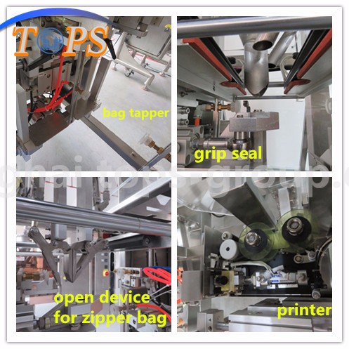 Packaging function is available on demand , and in capable of being integrated with Zipper Device/ Ribbon date printer/ Hopper Shaker/ Product Settler/bag taper.