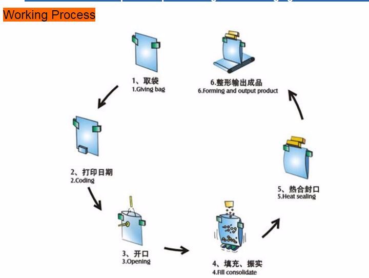 From Suck bag→Open bag→Filling→Sealing→Complete, the programmable logic control (PLC) system controls it all for effective improvement of packaging efficiency and quality.