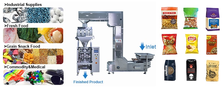 For materials requiring high accuracy of measurement or careful handling, such as puffed food,chips,beans,rice,sugar,salt,tea,dried fruit,dumpling,chocolate,candy,pet food,noodles,hardware,screw or commodity&medical. |