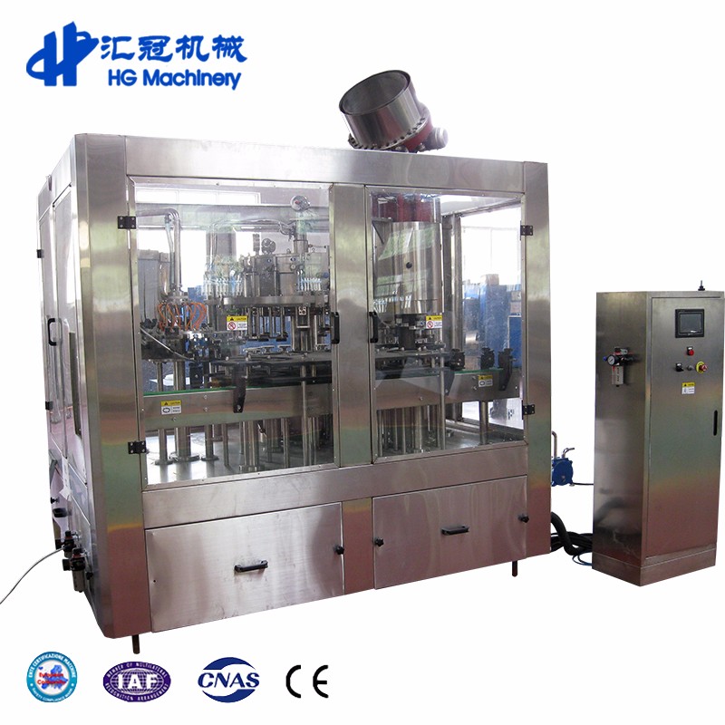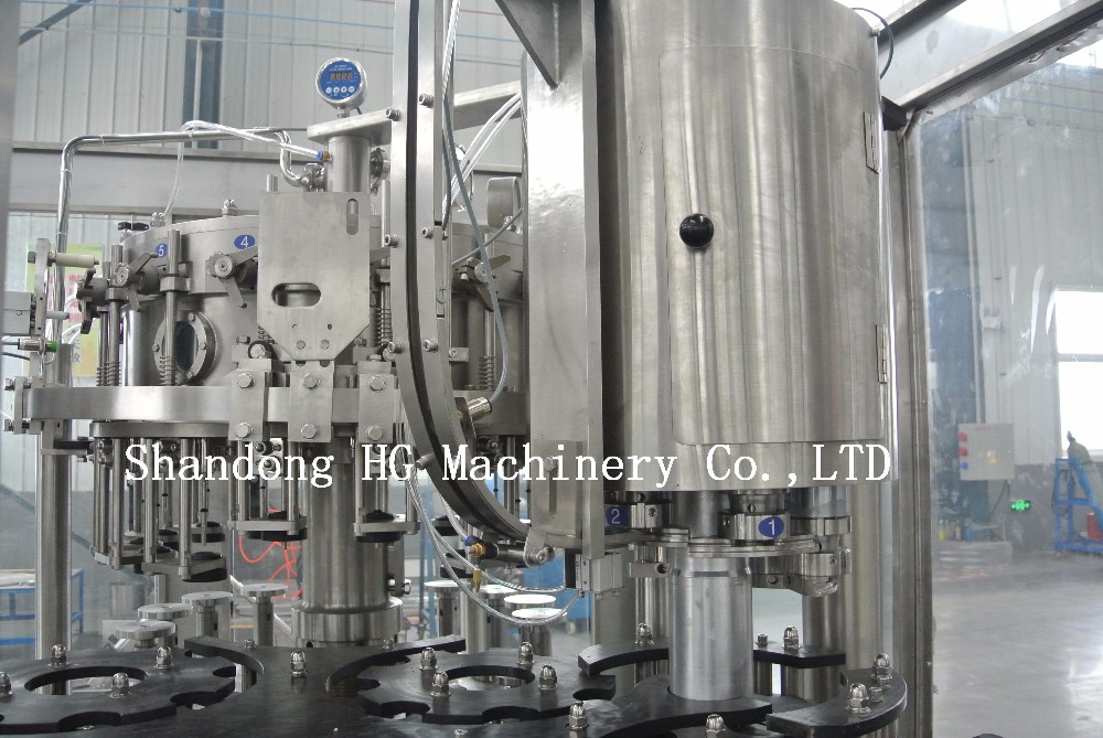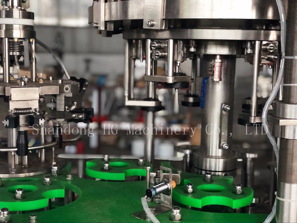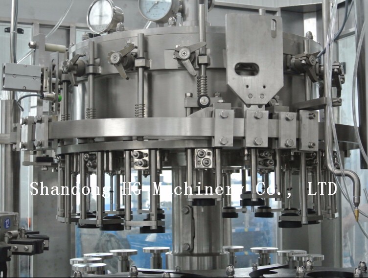 HG-GZ18/18/6 unit bottle filling and capping machine adopts isobaric filling principle and filling valve adopts high precision mechanical valve. It has advantages of fast filling speed, high precision in liquid level. Adopt MITSUBISHI automatic controlling system, realizing trinity of the machines, and control the washing, filling and capping process.