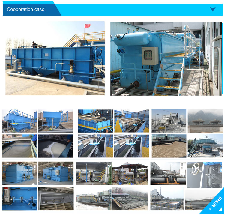 Air flotation technology of DAF dissolved air flotation plays an important role in solid-liquid separation (Simultaneously reduce COD, BOD, chroma, etc). Firstly, mix flocculating agent into raw water and stir thoroughly. After the effective retention time (lab determines the time, dosage and flocculation effect), the raw water enters into the contact zone where microscopic air bubbles adhere to the floc and then flows into the separation zone. Under the buoyancy effects, the tiny bubbles float the flocs to the surface, forming a sludge blanket. A skimming device removes the sludge into the sludge hopper. Then the lower clarified water flows into the clean-water reservoir through the collecting pipe. Some of water are recycled to the flotation tank for the air dissolving system, while others will be discharged.