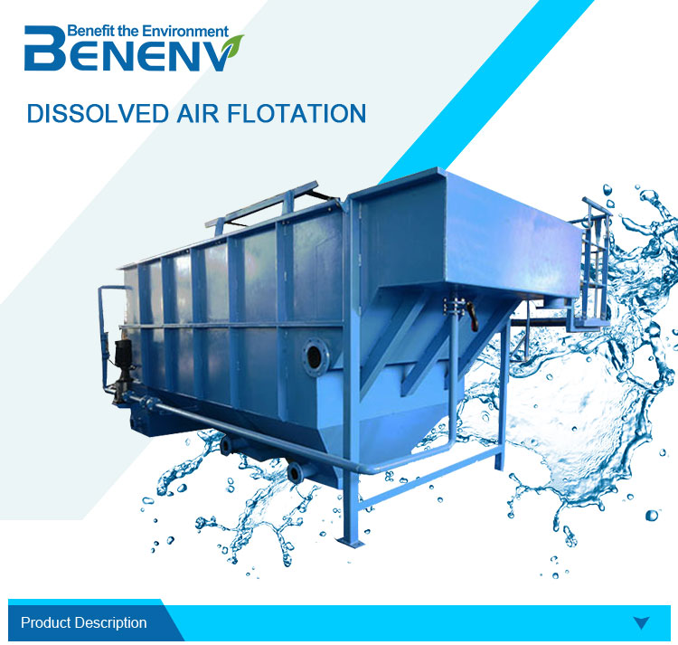 Dissolved air flotation is one of the most effective methods whose specific gravity is close to 1.0 from water.Dissolved Air Flotation is liquid/solid or liquid/liquid separation process to remove tiny suspended solids that density close to the water, colloid , oil and grease etc. Benenv dissolved air flotation is an innovation combined with traditional dissolved air flotation concept and modern technology.