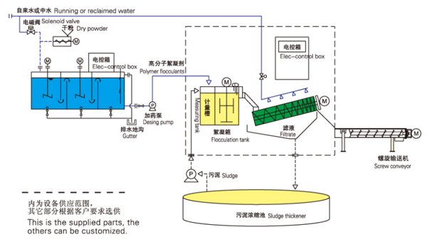 -There are no need to build the concentrated tank and storage pool,which will reduce the fees of construction . Electric control cabinet, the mixture of flocculant and dewatering sysytem form the integration , reduce the floor space, and easy to installing.