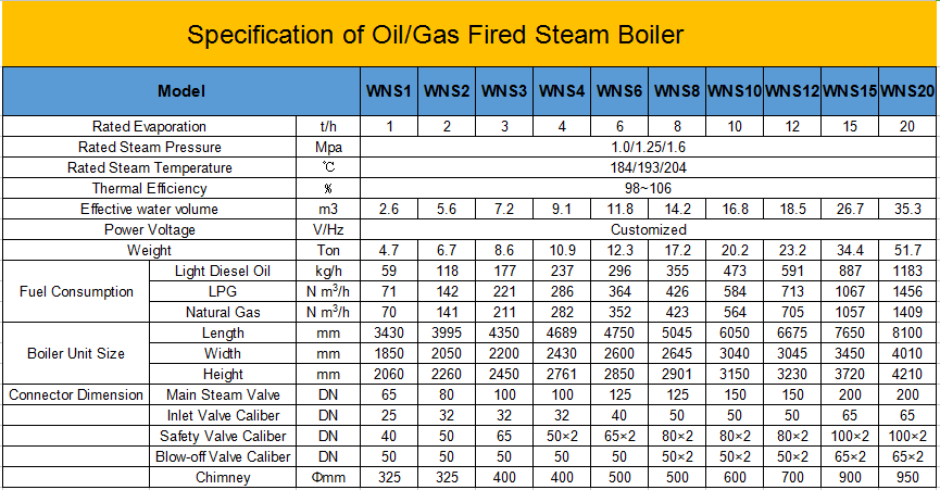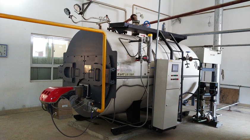 The gas or oil fired steam boiler is the fire tube boiler with 3 pass. The boiler adopts the bias furnace and wet back structure. The high temperature smoke flows through the first, second and third smoke pipes in turn. And then the smoke can be discharged into the atmosphere through the chimney. The boiler is provided with the movable front and back smoke boxes covers. So that the boiler is easy to overhaul. Also our boiler is equipped with the burner in great performance. The boiler is also with the functions of automatic combustion adjustment, automatic water feeding regulator, automatic program start or stop, automatic operation and other advanced technology. Besides, our boiler has the functions of high and low level alarm and limit low water level protection, over high pressure protection and automatic flameout protection function. The utility model boiler has the advantages of compact structure, safety, simple operation, quick installation, little pollution, low noise and high efficiency.