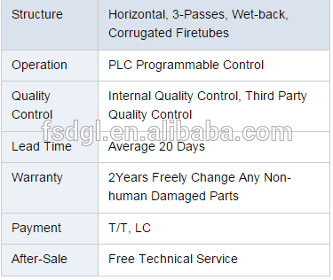 The steam boiler with center adjustment wet back three pass structure. The boiler is designed with the large furnace. The large furnace and adequate smoke tube effectively increase the radiation heating surface and improve the thermal efficiency of the boiler