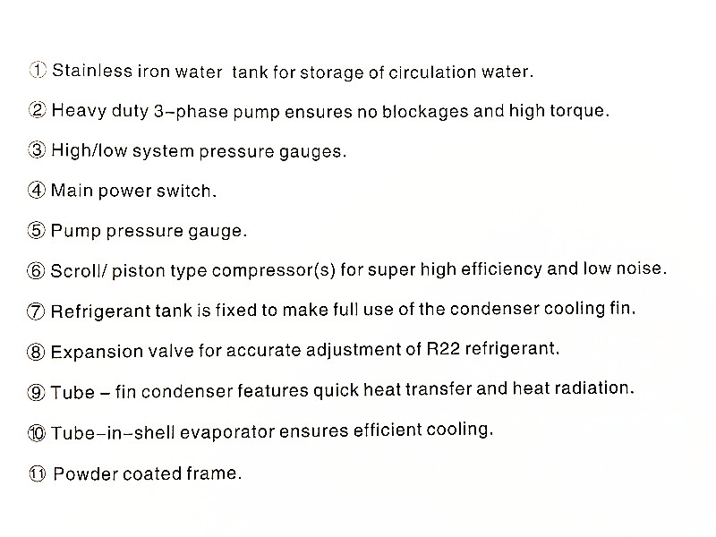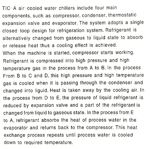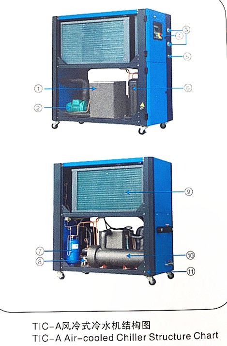 11) TIC-A adopts tube-fin condenser design without any need of cooling water for excellent heat transferand rapid cooling.