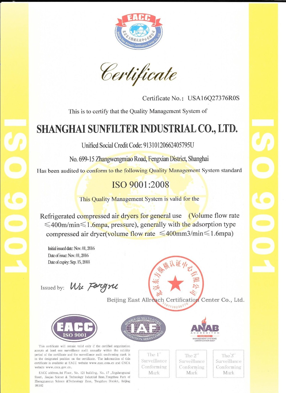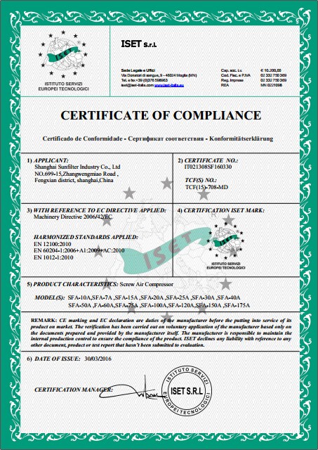 | Model of air filters | SFCTAAA-001 |