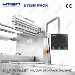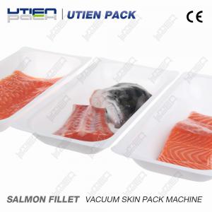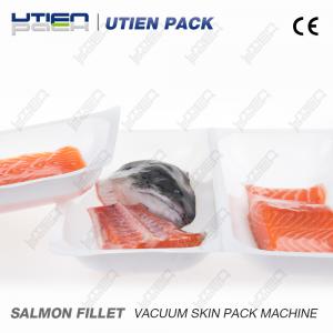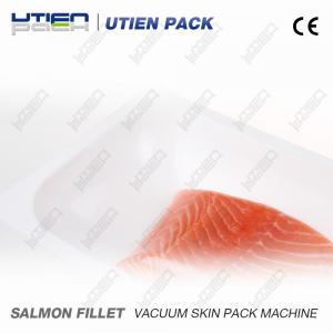 This is a Vacuum Skin Pack Salmon Fillet. The product is lower than the package and covered with shrinkable skin pack top film, Which cover the product tightly without any wrinkle. With high vacuum and best quality film the salmon fillet is fixed on the bottom tray and the water is contained in the fillet. The shelf life will be longer with this kind of package.