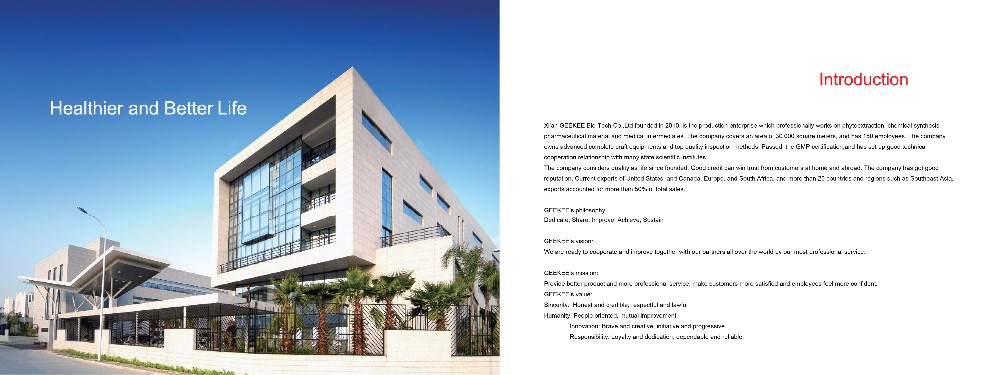 Xi’an GEEKEE Bio-Tech Co.,Ltd founded in 2010, is the production enterprise which professionally works on phytoextraction, chemical synthesis pharmaceutical material and medical intermediates. The company covers an area of 30.000 square meters, and has 150 employees. The company owns advanced complete craft equipments and top quality inspection methods, Passed the GMP certification,and has set up good technical cooperation relationship with many state scientific institutes.