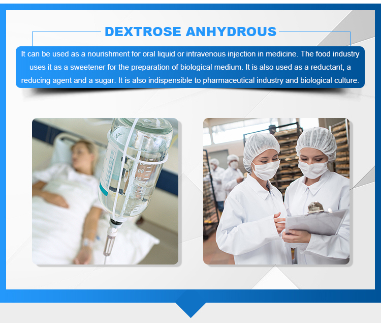 Colorless crystal or white crystalline powder; odorless and sweet. It is soluble in water and is slightly soluble in ethanol. The pharmaceutical industry generally use it as a needle and a large infusion material; the food processing industry as a nutrition and preservative; the fermentation industry as a carbon source of antibiotics, monosodium glutamate, vitamins and organic acids. What should not be neglected is that it can also be used in printing, dyeing, leather making, electroplating and other chemical industries.