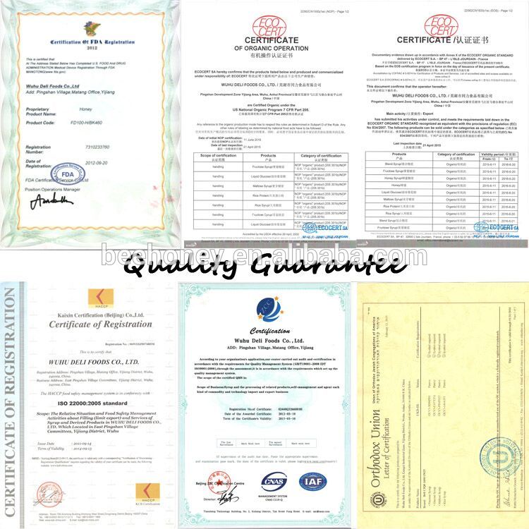 Wuhu Deli Foods Co.,Ltd. was established in 2008 and formerly known as wuhu deli factory with more than 10 years experience of food developing and producing. It is an export-oriented manufacturer and specialize in the production of honey,honey powder, honey syrup,rice syrup, fructose syrup, ,maltose syrup,flavor syrup,rice protein and a series of organic products. We have a complete quality management system and strong ability of research and production.We also passed QS, ORGANIC, HALAL, ISO, HACCP, KOSHER certification.