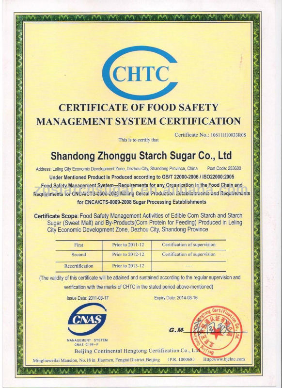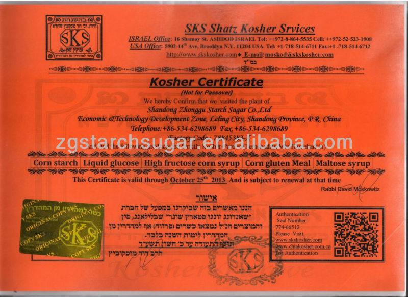 | Brief introduction High Fructose Syrup is processed from hydrolyze corn stach and contains fructose a simple sugar carbohydrate,just like sucrose,it is about 75% sweeter than sucrose,less expensive than sugar,and mixed well in many foods,the content of fructose is more than 42% of total carbohydrate | ||||||