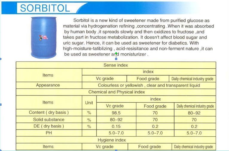 Sorbitol is a new kind of sweetener made from purified glucose as material via hydrogenation refining,concentrating.when it enters into human body,it spreads slowly and then oxidizes to fructose,and takes part in fructose metabolization.it doesn’t affect blood sugar and uric sugar. Hence,it can be used as sweetener for diabetics.with high-moisture-stabilizing,acid-resistance and non-fermentnature,it can be used as sweetener and moisturizer.the sweet intensity contained in sorbitol is lower than that in source,and it can be utilized by some bacteria.it can be widely used in many industries such as food,leather,cosmetic,papermaking,textile,plastic,toothpaste and rubber.we can manufacture products based on the demands of customers.